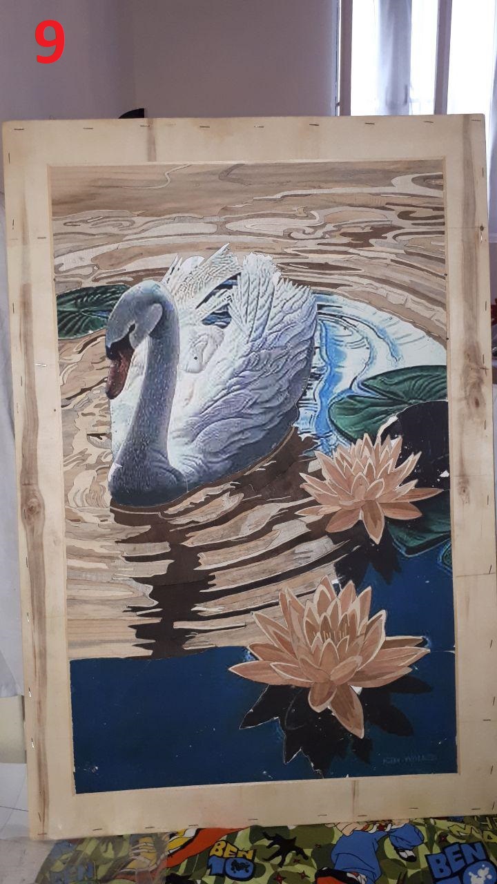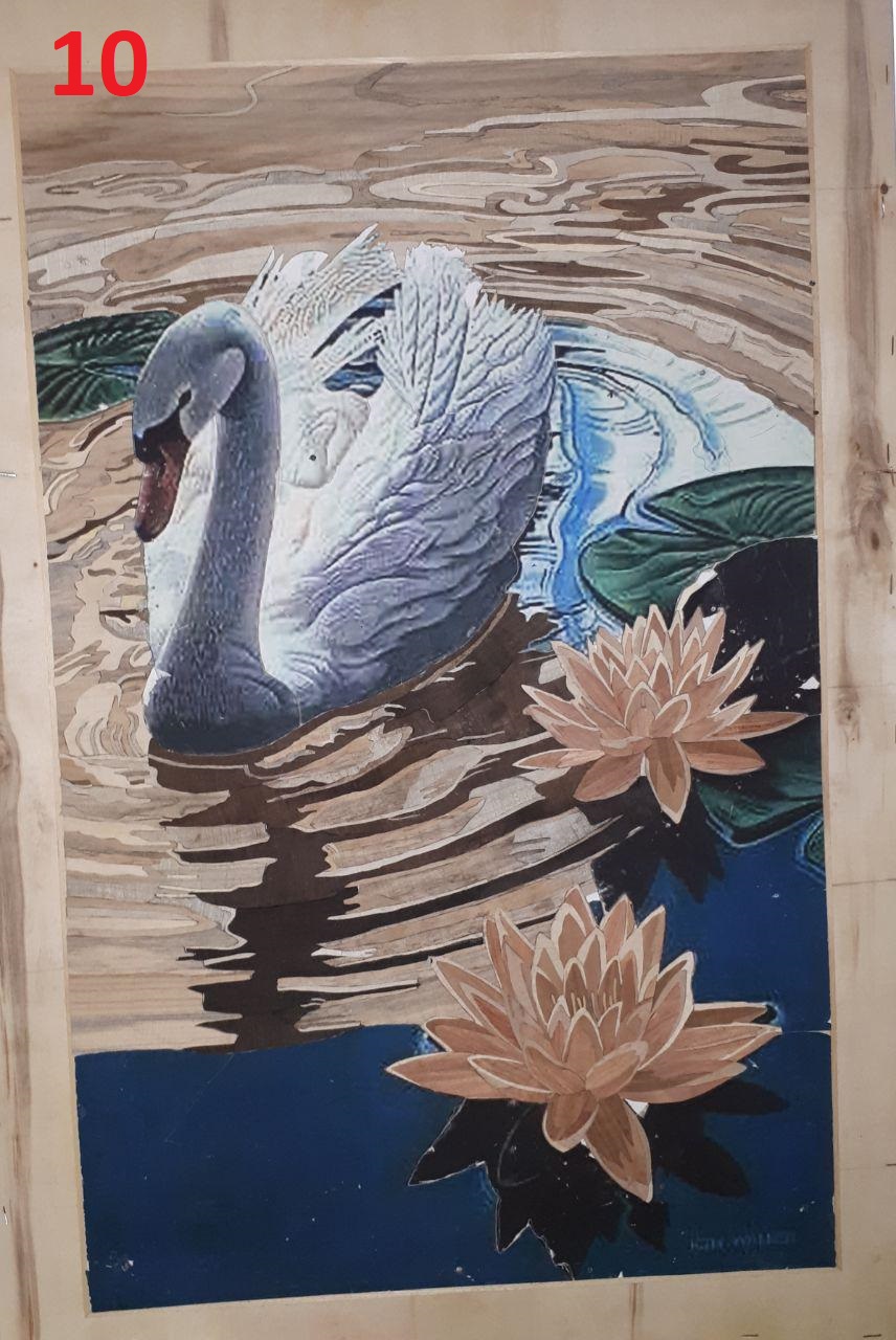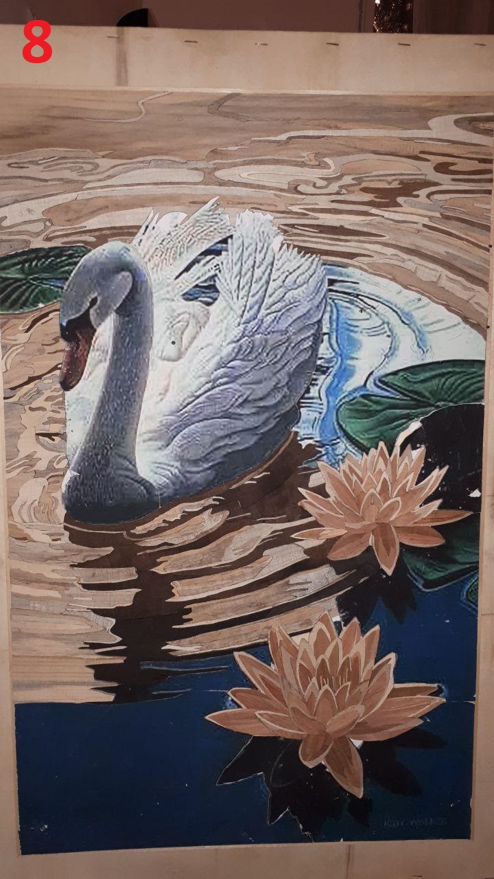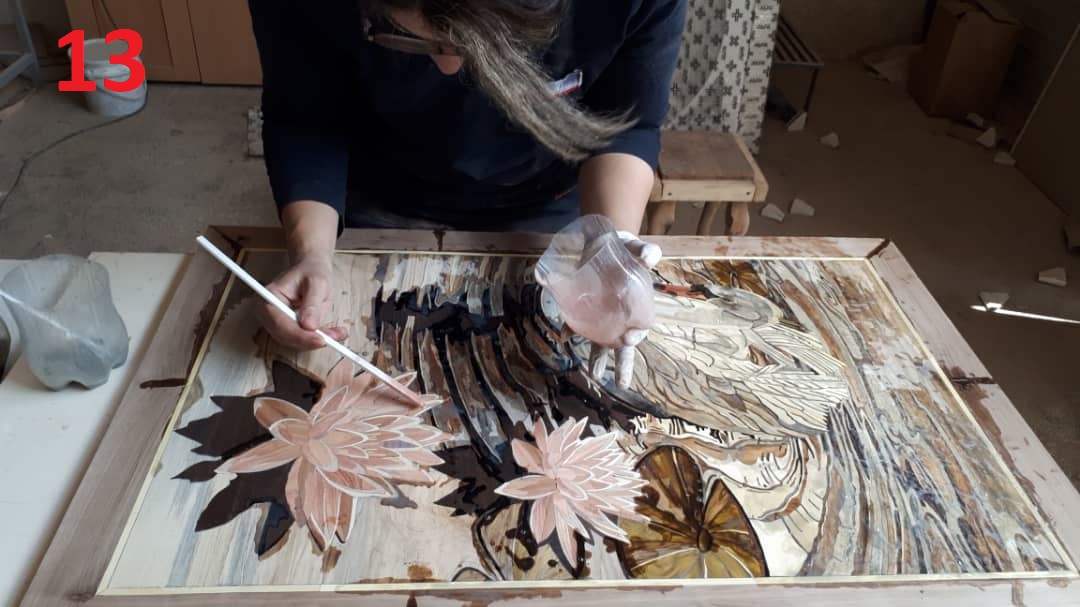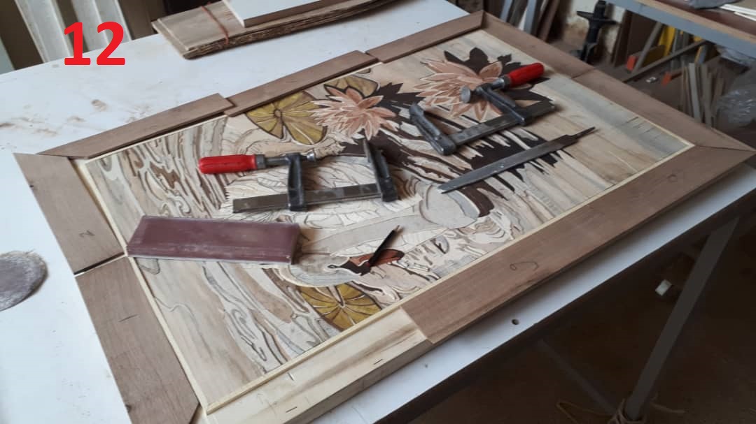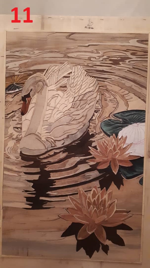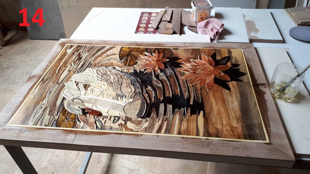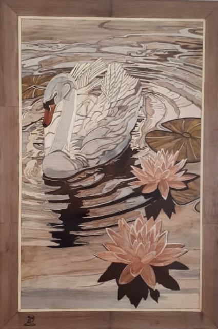 در این تابلو از چوبهای افرا در رنگهای مختلف، گردو،گردوی سوخته، کرات،نارنج، اقاقیا، عناب و.... استفاده شده است