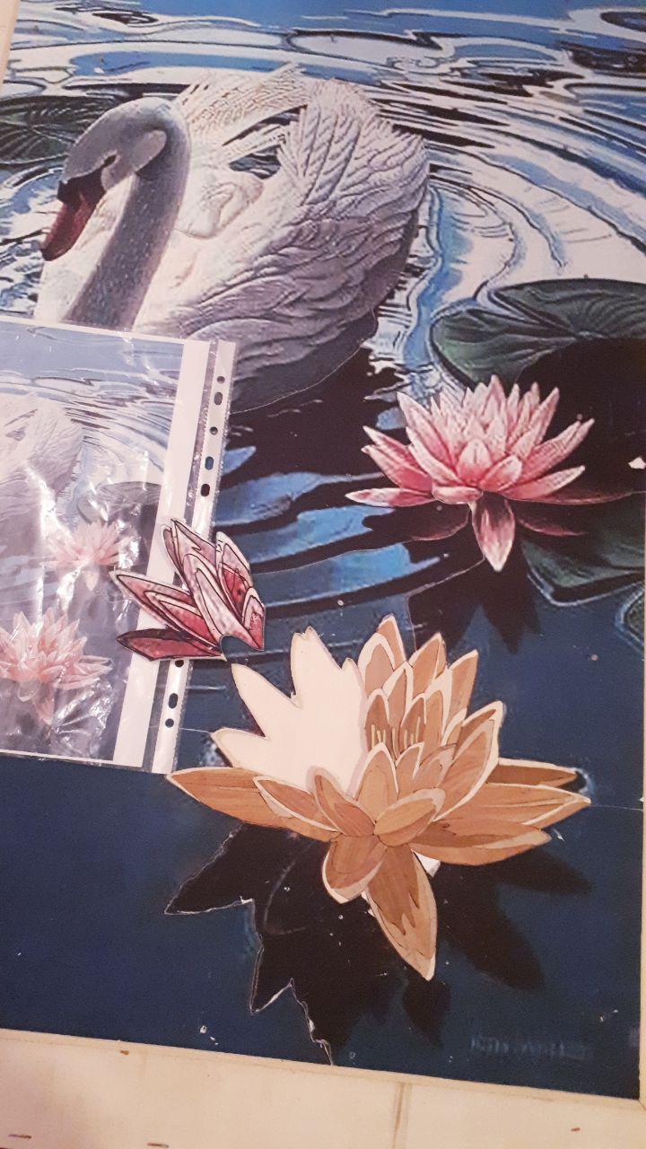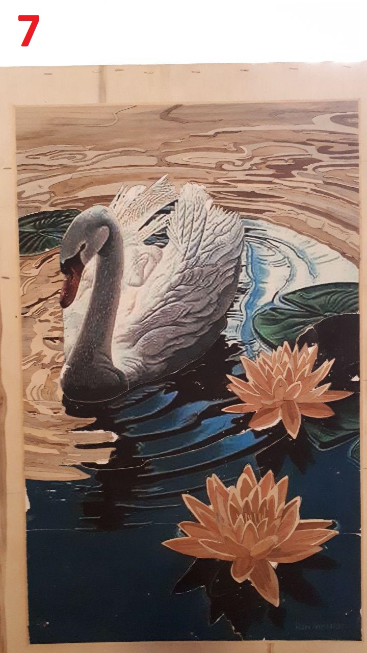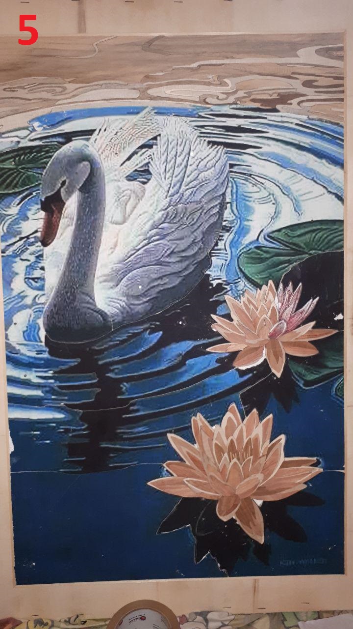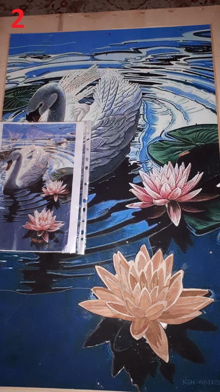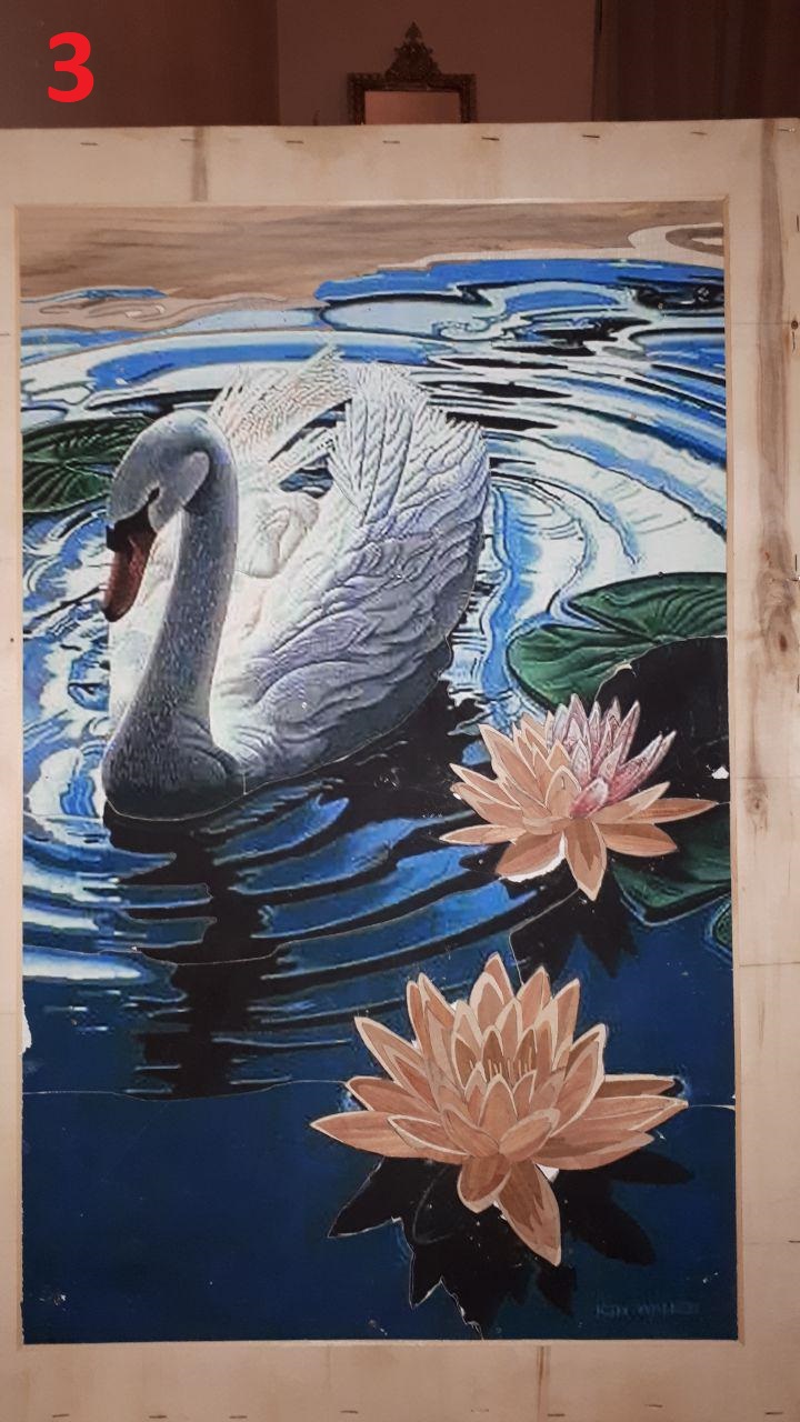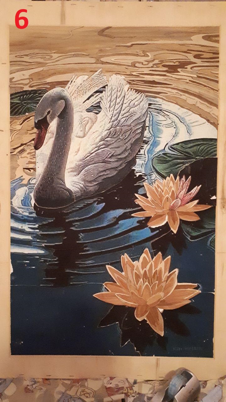 در این تابلو از چوبهای افرا در رنگهای مختلف، گردو،گردوی سوخته، کرات،نارنج، اقاقیا، عناب و.... استفاده شده است